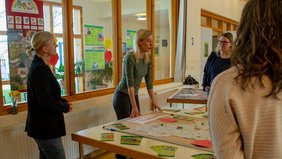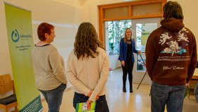 Und dann wendet er sich nach vorne, denn es geht los: Volker Wahlers begrüßt die neuen Kolleg:innen, stellt das Gesamtunternehmen vor und gibt den Anwesenden grundlegende Informationen mit an die Hand, unter anderem zum Aufbau und zum Leitbild. Der nächste Programmpunkt heißt „World-Café“. Das ist eine interaktive Workshop-Methode, die unter anderem zur Teamentwicklung eingesetzt wird. Dabei verteilen sich die Teilnehmer:innen in kleinen Gruppen auf insgesamt sieben Stationen, die sie reihum besuchen. Dort stellen ihnen die Bereichsleitungen der LEBENSHILFE Bremervörde/Zeven sowie der Betriebsrat und das Qualitätsmanagement jeweils ihre Tätigkeitsfelder, Arbeit, Abläufe und Standorte vor, beantworteten Fragen und tauschen sich mit den neuen Mitarbeitenden aus.